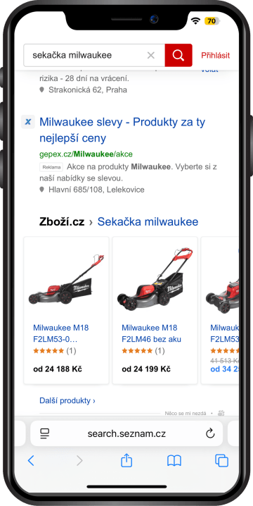 Produktová reklama zobrazí uživatelům vizuální přehled produktů přímo po zadání hledaného dotazu. V katalogu se zobrazí i váš produkt s fotkou, cenou a názvem, což usnadňuje zákazníkům rychlé porovnání a nákup.